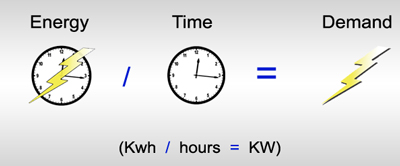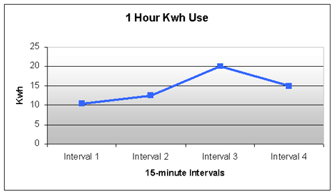 Why you should care about Demand (KW)Your electric bill is the most relevant area demand appears. For all commercial customers and some residential customers (depending on the utility) there is a portion of the electric bill called a Demand Charge. The Demand Charge is the amount you are charged per KW, and this depends on what Demand Rate the utility places you on. There are three basic rate classes; Small General Service (SGS), Medium General Service (MGS) and Large General Service (LGS). For this explanation we will focus on SGS and MGS. In many cases, SGS has the demand charge embedded within the Kwh charge. MGS usually has the regular Kwh charge plus a demand charge. Many times the rate threshold between SGS and MGS is 25KW. So for some businesses the goal is to stay below 25KW to remain on the SGS rate and obtain lower total costs on their electric bills. So how does the utility determine which Demand Rate to place you on? Well it all depends on your Peak Demand. Most utilities divide your electric use into 15-minute intervals. The meter averages your Kwh use for each of those 15-minute intervals. The highest 15-minute interval (in that billing period) is your peak demand for that month. In an average 1 month billing period you have about 3,000 opportunities to set the peak demand. Example: This table shows one hour of electric use- only 4 of 3,000 intervals in a typical month/billing period. As you can see, 80KW ends up being the Peak Demand out of these four 15-minute intervals.
