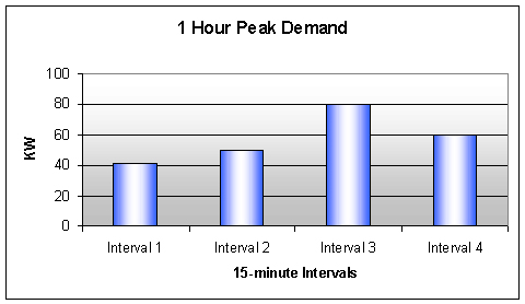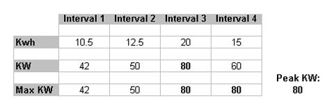 Example: This graph shows KW from the table above. As you can see Interval 3 with 80KW ends up being the Peak Demand out of these four intervals.