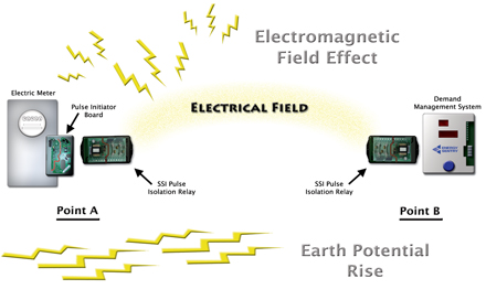 If lightning were to strike nearby, the electrical field between Point A and Point B would attract the voltage and current surges (caused by secondary effects) sending a power spike through the field to either end of the configuration. The greater the distance between Point A and Point B, the higher the probability of attraction. The isolation relay would be the first point of contact that the power spike would have to break through. If the power spike managed to travel through all the barriers of the SSI board it would still need to travel through the barriers in the utility pulse board before it could reach the meter or other electrical equipment. In most situations the SSI relay is sufficient enough protection to prevent further travel of the power spike. If damage were to occur, it would most likely only affect the SSI relay, which is MUCH LESS Expensive than the total cost to replace the meter or other complex energy equipment. | |||||||||||