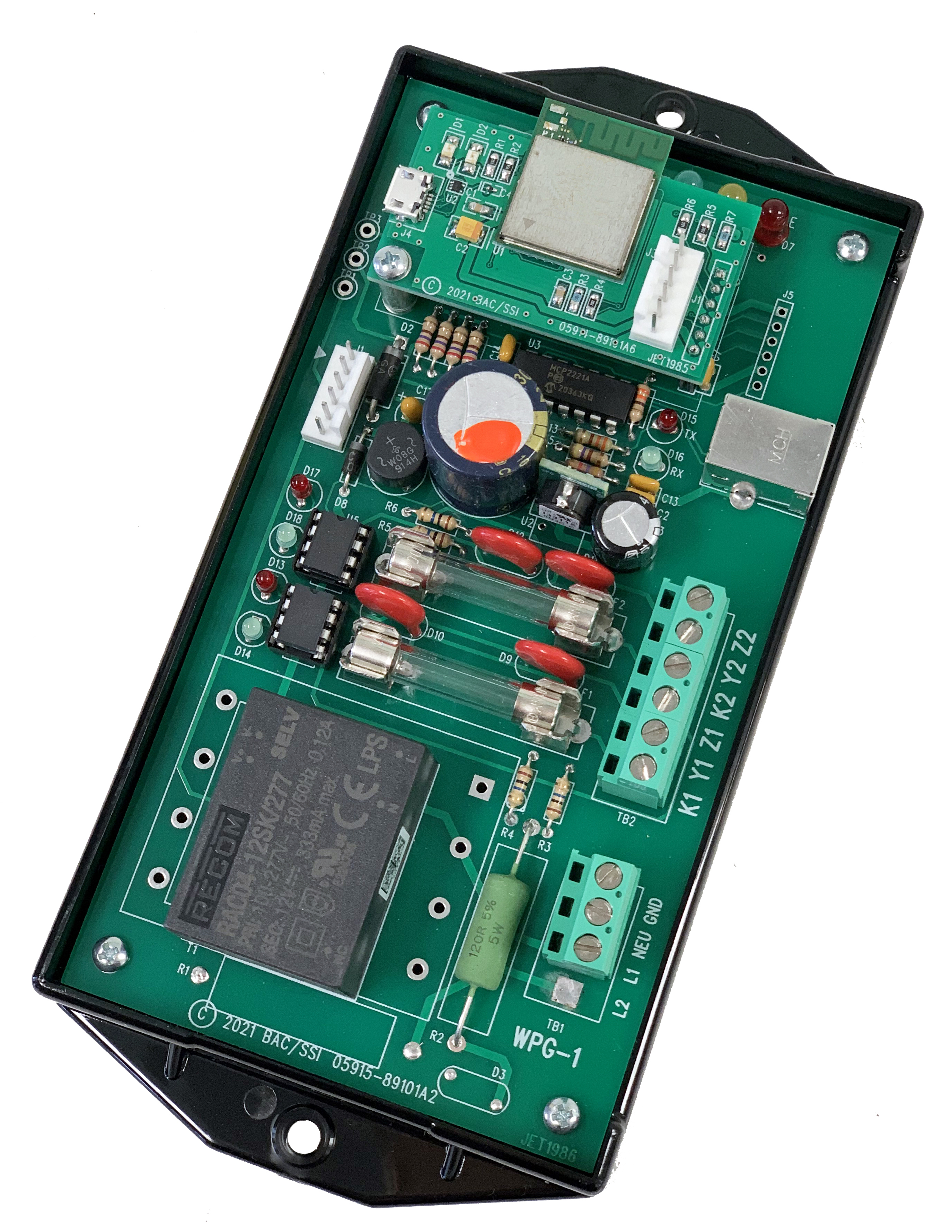 The output pulse value is selectable from 1 to 99999 watt-hours, va-hours or var-hours per pulse. Each of the two outputs may be set independently for type and value of the pulse. A meter multiplier of 1 to 99999 may be programmed into the WPG-1 using the SSI Universal Programmer software. A 30mS fixed minimum-off time delay prevents pulses from occurring too rapidly. Bright red, yellow and green LEDs monitor the system communications status and provide an easy and immediate visual system check without test equipment.